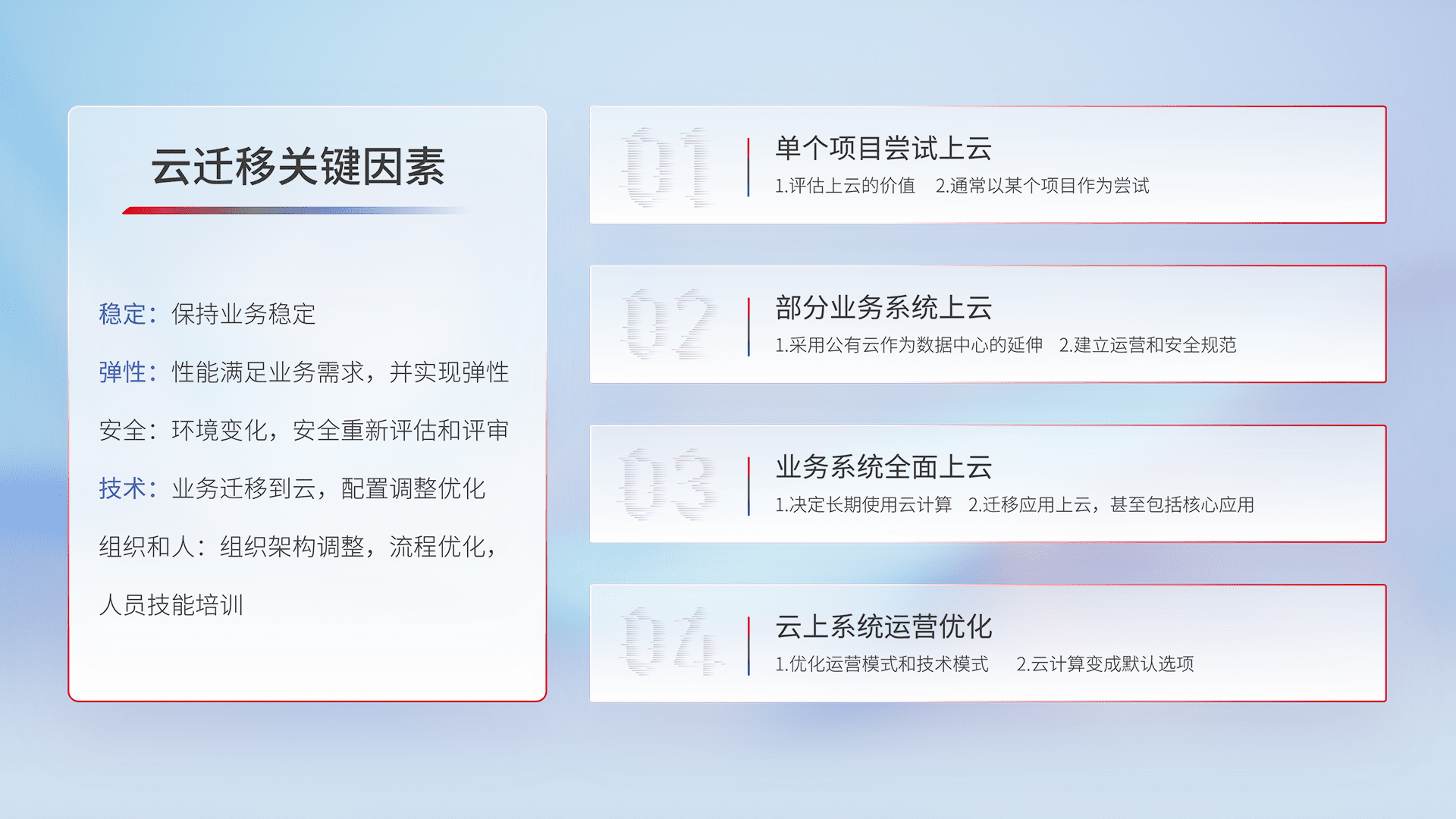 结合实际业务,,从规划设计、、、、云平台选型、、云原生改造、、数据迁移、、、、集成交付,,,迁移全过程为客户识别最佳上云路径,,,,做好风险识别管理,,设计网络架构、、身份权限、、、安全审计合规、、操作审计、、、、日志审计、、、、监控告警策略、、多站点容灾设计等,,,,对云上基础设施进行整体规划,,提升IT治理水平,,,,以满足弹性、、高可用、、、高性能的需求。。