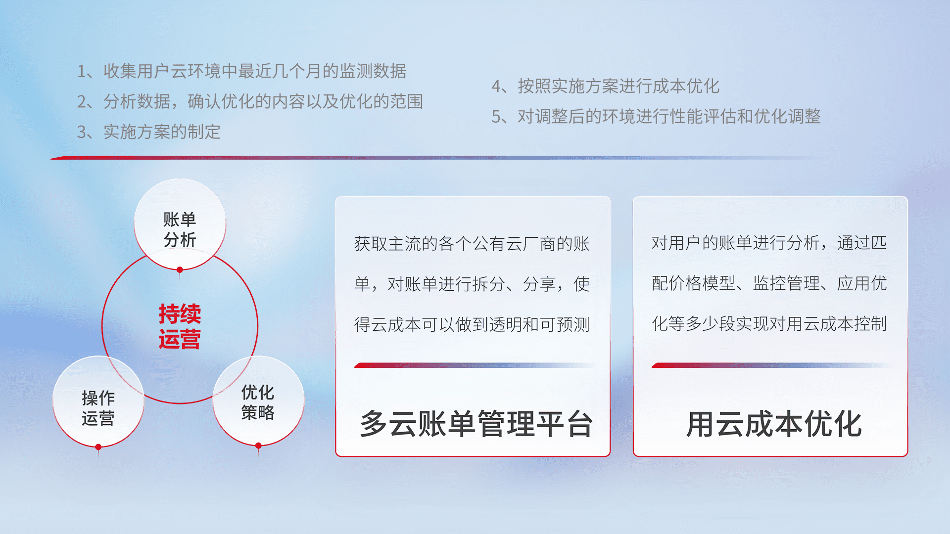 通过多云纳管,,,,以统一的资源数据模型把客户的云资源进行抽象和封装,,进而实现对多云资源的统一操作,,,,保障云资源管理的可靠性、、稳定性与可用性。。。量身定制化运维内容,,配置、、、开发运维、、补丁管理、、、、备份、、监控、、、认证和访问管理、、审计和日常巡检等,,保障在用云过程中的可靠度,,,,稳定度以及高可用率。。。
